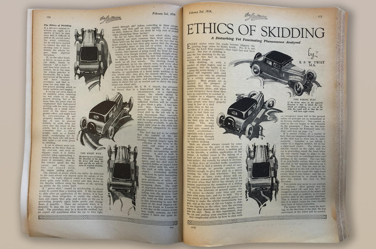 Twist’s logic was that any application of opposite lock must become instinctive: “One cannot, as soon as the car begins to skid, remark to the passenger, ‘Pass me the issue of The Autocar for February 2nd, my dear, and turn to page 173’.”