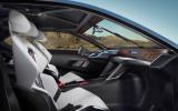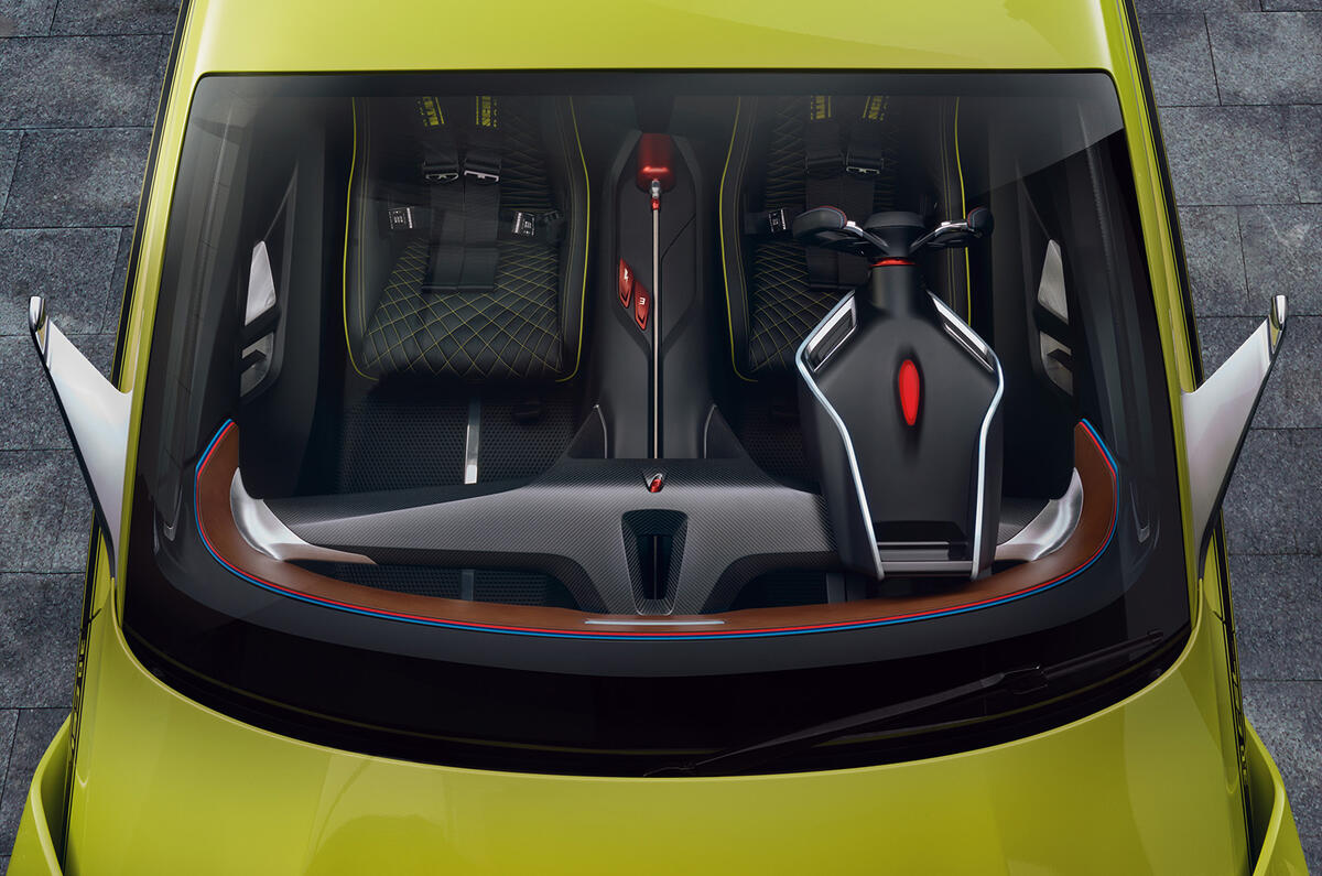 The minimalist steering wheel display provides the driver with information on the current track and race position. Other racing additions to the interior include a fire extinguisher system and an emergency shut-off.