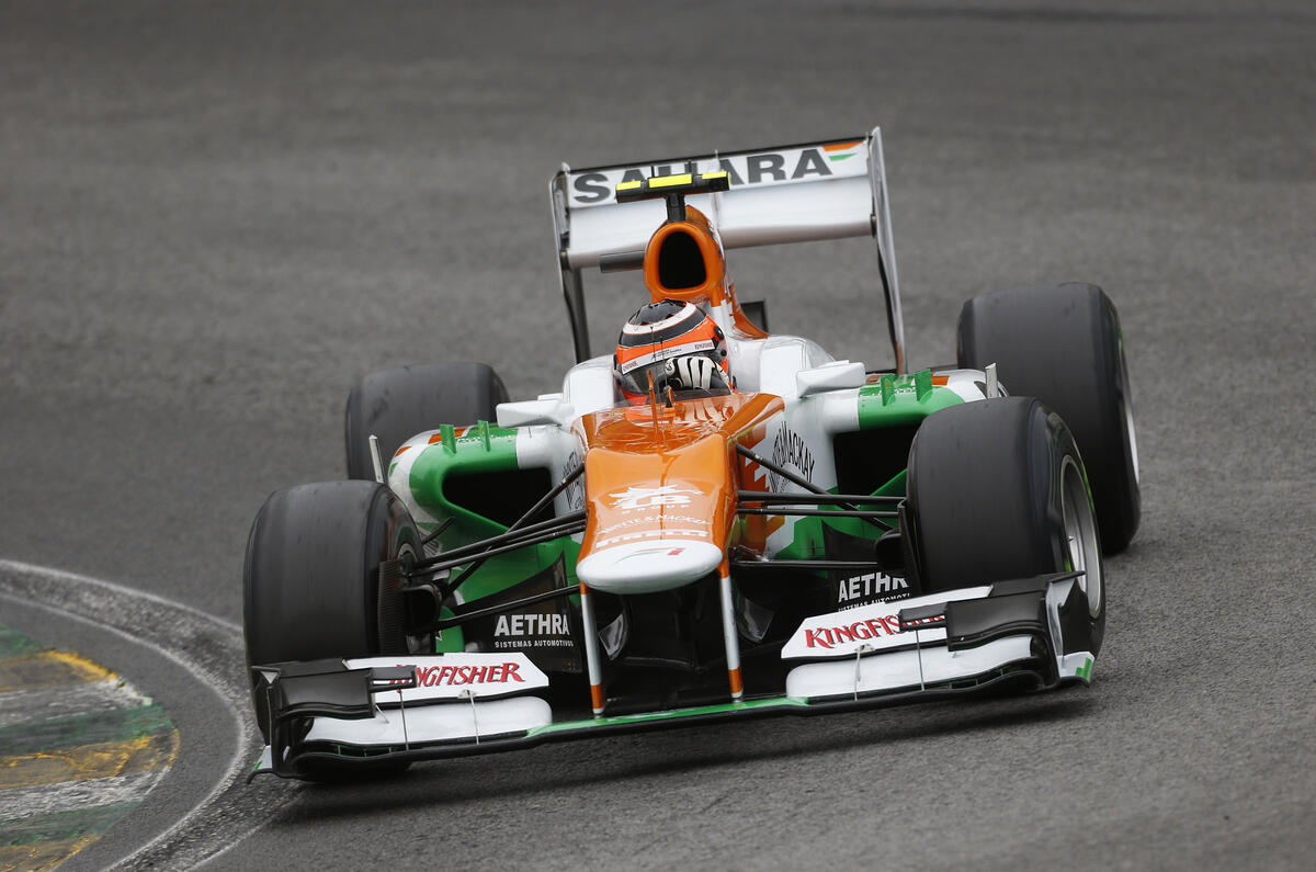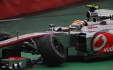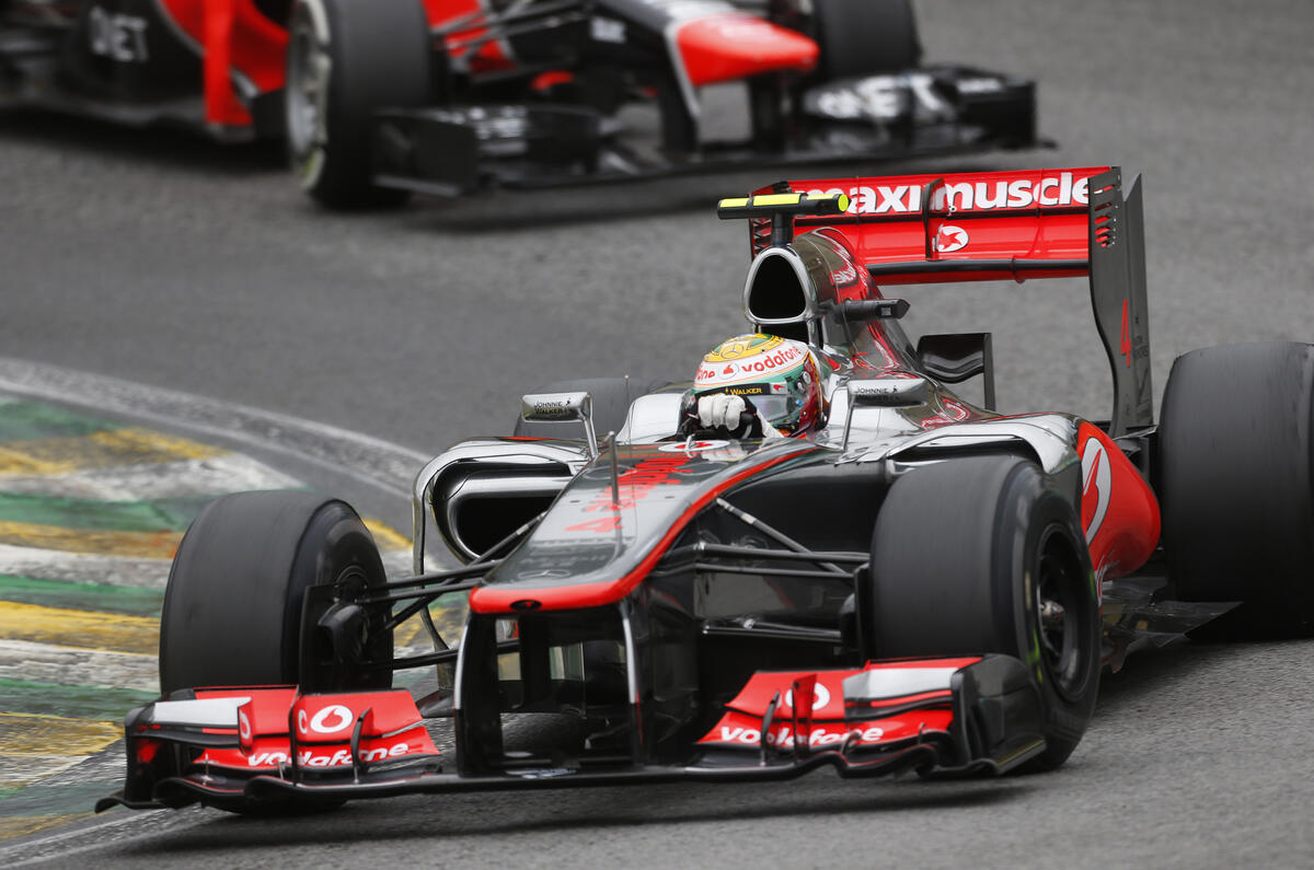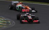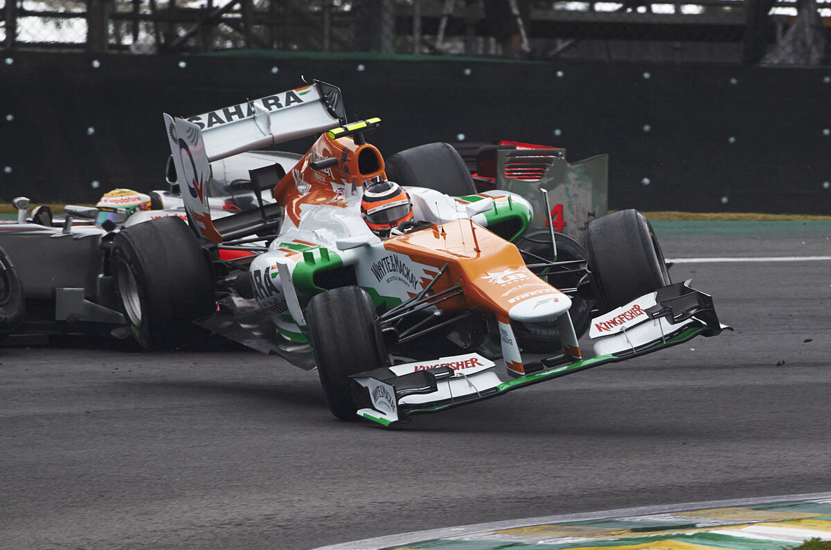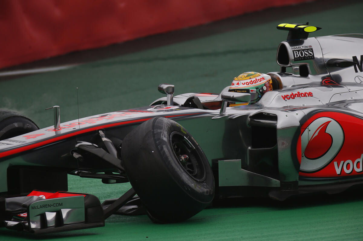 With the field bunched up, Hulkenberg pulled away, with Hamilton passing Button and giving chase. A mistake from Hulkenberg let Hamilton through, but the Force India driver clung on and made a move at two-thirds distance as they lapped traffic. However, he lost control in the damp conditions under braking and slid in to Hamilton. The Briton, in his final race for McLaren, had to retire, while Hulkenberg got a drive-through penalty.
