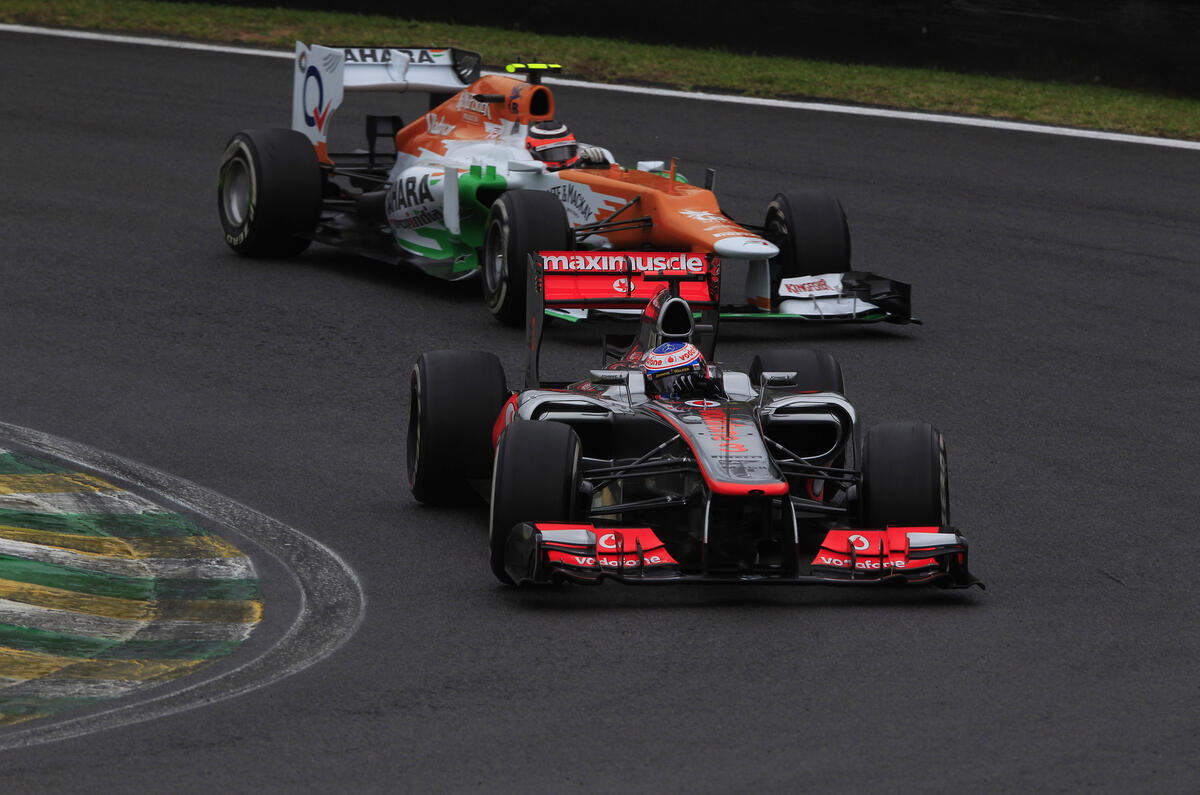 Out at the front, Button, team-mate Lewis Hamilton and Force India’s Nico Hulkenberg all showed superb pace in the damp, with all three taking turns in the lead. By staying on slicks while other runners pitted for intermediates, Button and Hulkenberg pulled out a huge lead, with the German passing the Briton after a long duel, but their advantage was undone by a safety car period.
