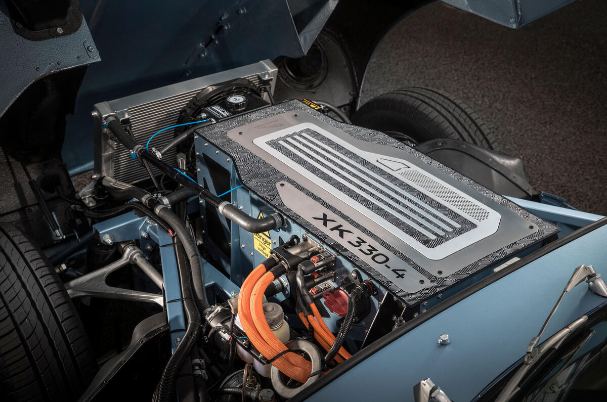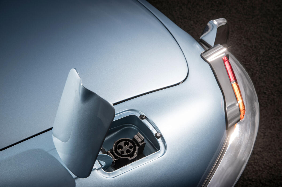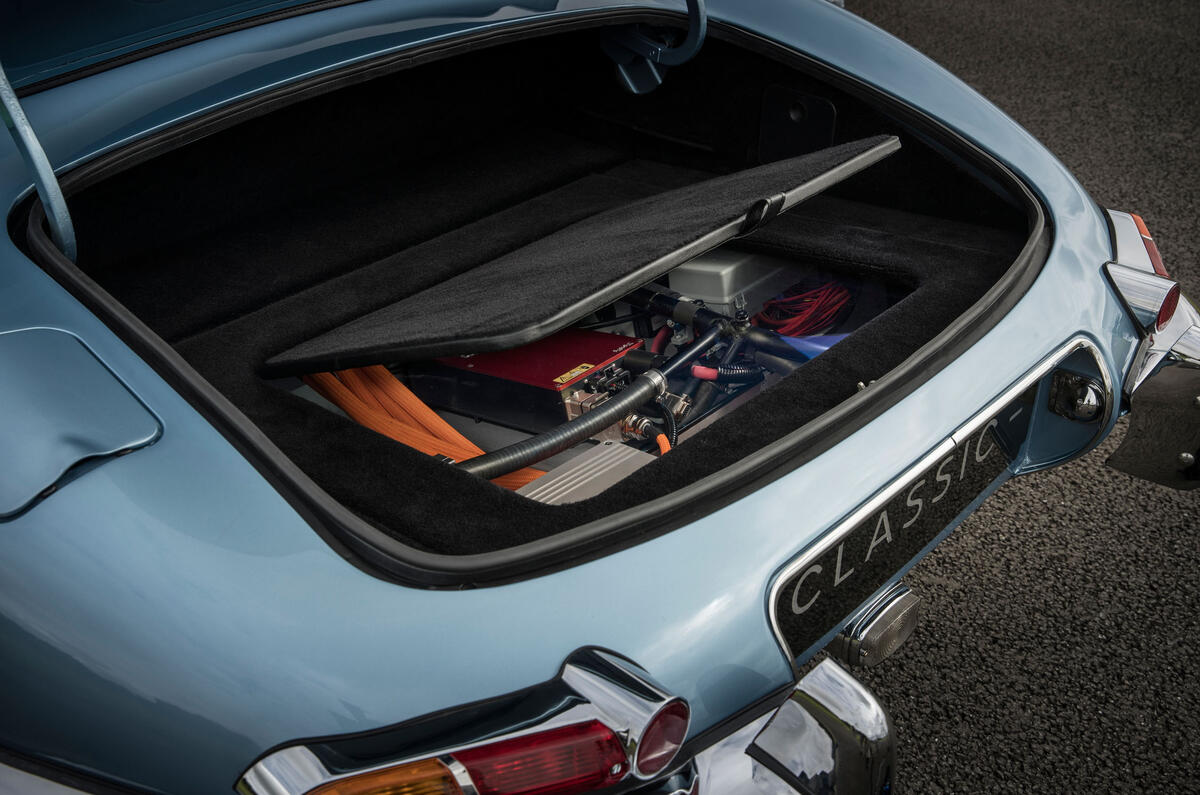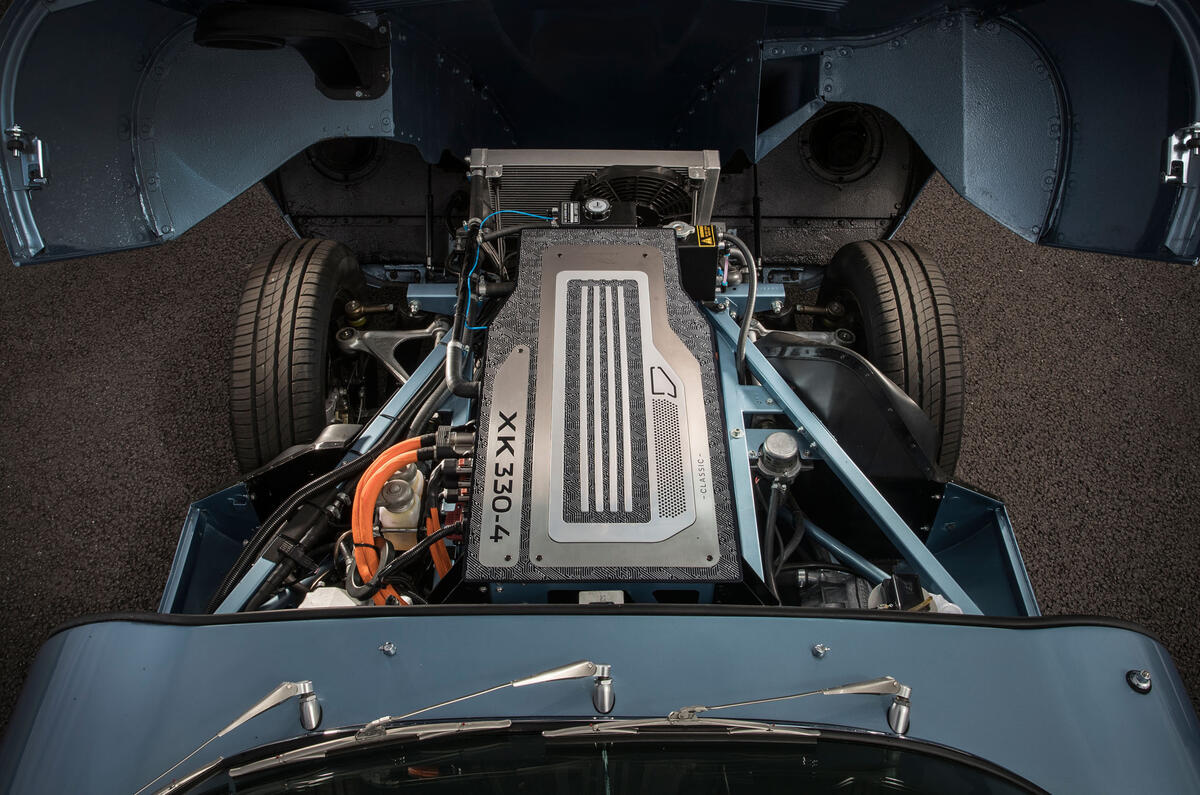 The battery of the E-Type Zero takes the place of the original's 3.8-litre six-cylinder iron-block engine under the bonnet, with the electric motor fitting in the space of the newly absent gearbox. The E-Type Zero weighs 46kg less than the original.