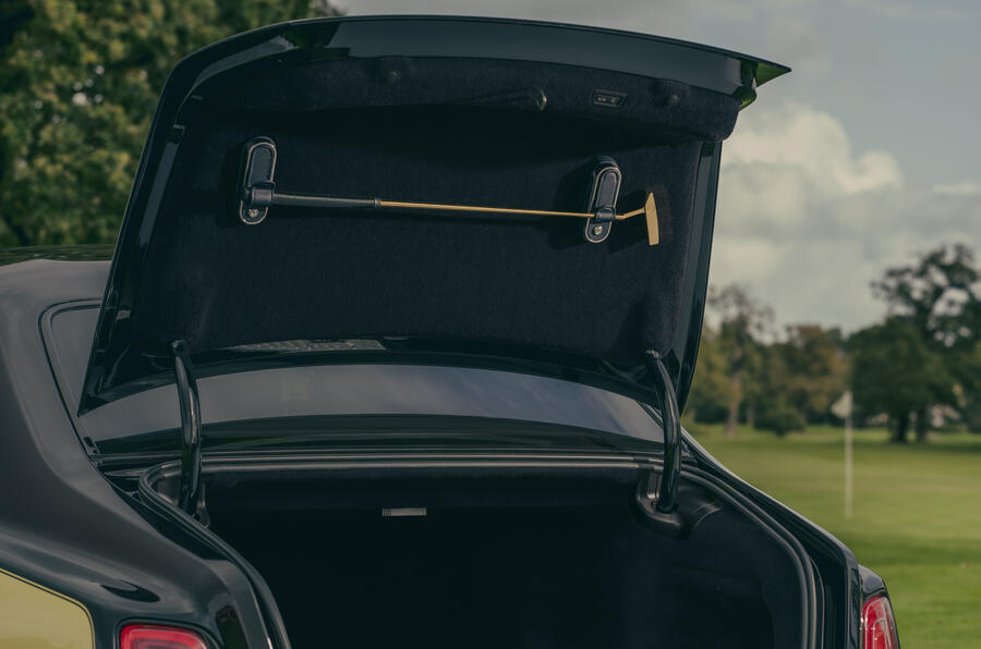 Aside from the famous two-tone paint, all of the special features are found inside, from an 18-carat solid gold bar (cut in the shape of a Phantom Speedform) in the centre console to a gold golf putter fitted to the boot lid - a reference to Bond's first encounter with Auric Goldfinger at Stoke Park in the film.