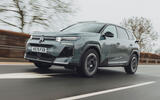 The main central touchscreen has a portrait orientation and flows into the centre console. Citroën calls this the ‘waterfall’ screen. The whole surface is gloss black plastic, so does attract fingerprints, but feels solid enough and is livened up with a neat pattern. Citroën has had some fun with the colours and materials too. To find hard plastic atop the dashboard and doors is a bit disappointing in this segment, but lower down the light grey fabric brightens up the cabin and is pleasant to the touch. As standard, Max trim gets dark blue faux leather and lower trims get black. The light-coloured plastic in the very practical centre console and door bins is made with offcuts from grapevines.