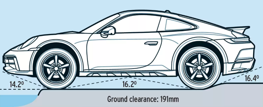 Clearly, the Dakar’s all-terrain tyres, Cayenne- style ground clearance (when the suspension struts are extended) and 16mm-shorter front overhang compared with the regular 911 aren’t just for show, and while the underside isn’t entirely panelled, there is a fairly comprehensive level of protection that even extends to individual suspension links. The front rads also have specific stone-chip protection.
